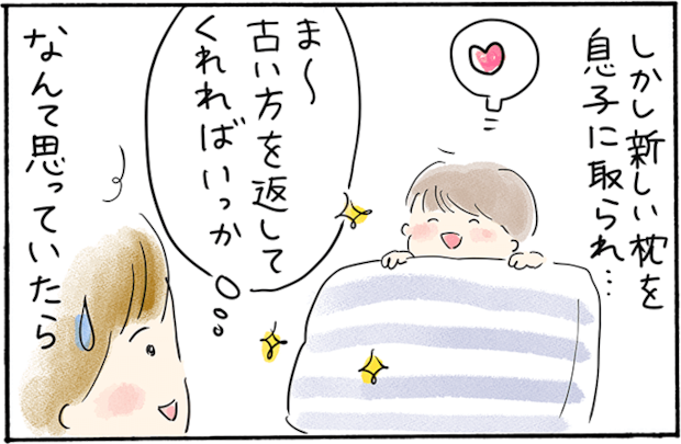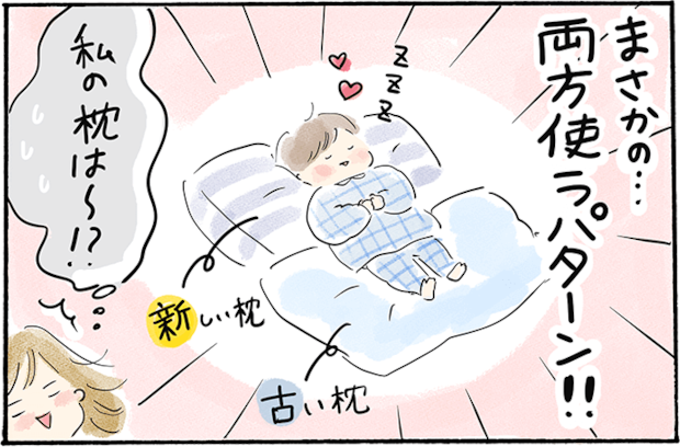 近ごろ、夜中に2歳の息子くんから枕を奪われてしまうというママさん。息子くんはママの枕を使うとすぐに眠ってくれるものの、起こされたママさんは寝不足気味。そこで新しい枕を用意し、これでひとり一つの枕で眠れる♪と思っていたところ、枕を二つとも息子くんに独占されてしまうという予想外の事態に…! 息子くんは新しい枕と、ママのぬくもりが残る枕、両方とも手放せなかったようですね。満足げに眠る息子くんの、ほっこりかわいらしい体験談です。ママさん、どんまい!