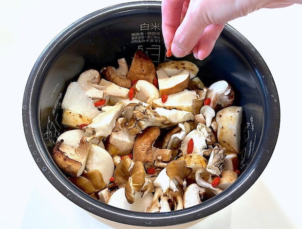 5. 4に3を入れ、クコの実を散らして炊く。