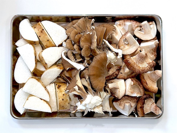 まいたけは割りほぐし、しいたけはいちょう切りにする。