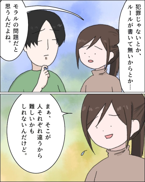 「犯罪じゃないとか、ルールが書いて無いからとか・・モラルの問題だと思うんだよね。まぁ、そこが人それぞれ違うから難しいかもしれないんだけど」とヒロユキさんの気持ちにも理解を示しながら諭すように話すアキナさん。