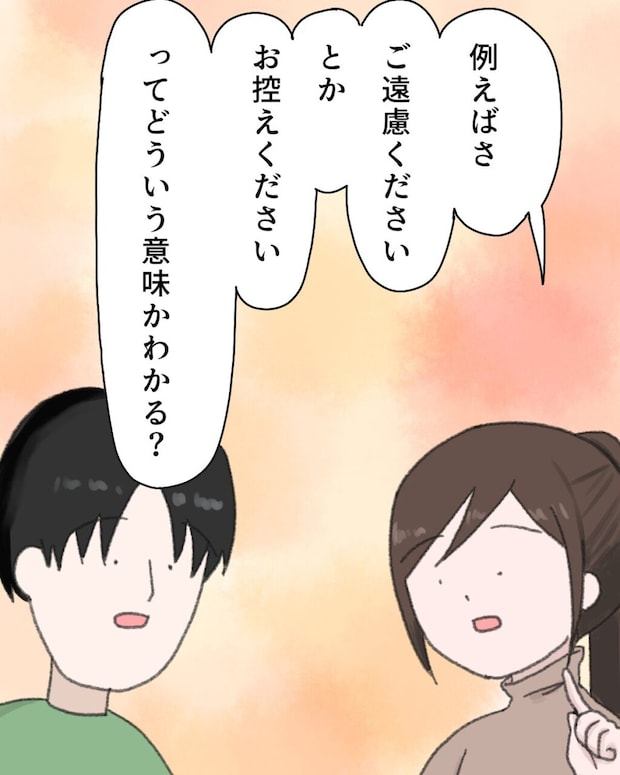 まだ難しい顔をしているヒロユキさんに、アキナさんは「例えばさ、『ご遠慮ください』とか『お控えください』ってどういう意味かわかる?」と問いかけました。