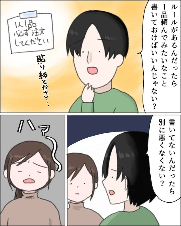 「ルールがあるんだったら1品頼んでみたいなこと書いておけばいいんじゃない?書いてないんだったら別に悪くなくない?」と言うヒロユキさんに、アキナさんは「ハァ~~~」と大きなため息をつきました。