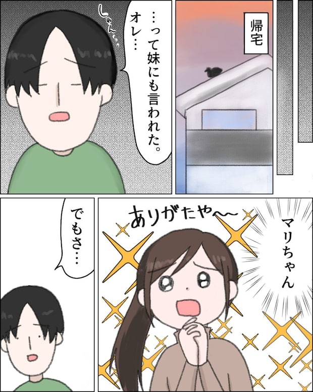 「・・って妹にも言われた。オレ・・」と実家からしゅんとした様子で帰って来たヒロユキさんがマリさんに言われたことを話すと、「マリちゃん!ありがたや~」と言いたくても言えなかったことをはっきり言ってくれたマリさんに感謝したアキナさん。しかし、「でもさ・・」とまだ納得できない様子のヒロユキさん。