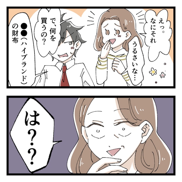 予想外の展開です。「えっ。なにそれ」と思わず顔がにやける私に「うるさいな・・」と面倒くさそうなショウ。「で、何を買うの?」と興味津々で聞くと、「●●の財布」と教えてくれたのですが・・「は??」私は耳を疑いました。ショウが口にしたのはハイブランドの名前。えっと・・それ、超お高いやつだよね?