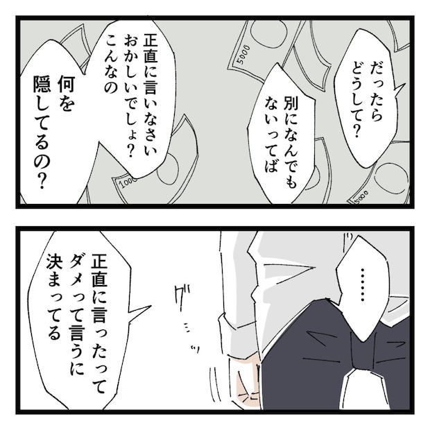 「だったらどうして?」と追及するも「なんでもない」と言い張るショウに、私は「正直に言いなさい。おかしいでしょ?こんなの。何を隠してるの?」と問い詰めました。すると、少しの沈黙の後、「正直に言ったってダメって言うに決まってる」とショウがぽつりと口を開きました。