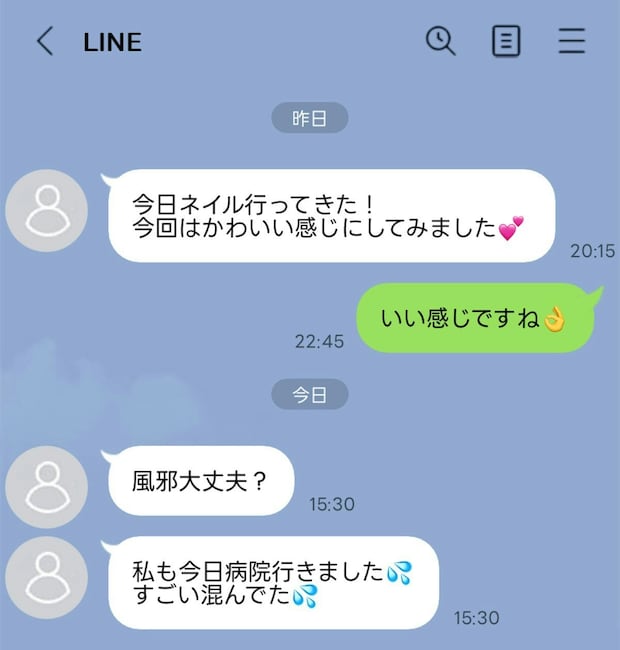 「風邪大丈夫? 私も今日病院行ってきた!」です。