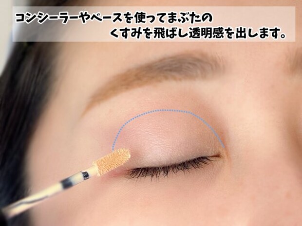 ベージュ・クリーム・薄ピンクなどの明るい色をまぶた全体に薄く広げます。目元用のトーンアップベースやコンシーラーでOK。