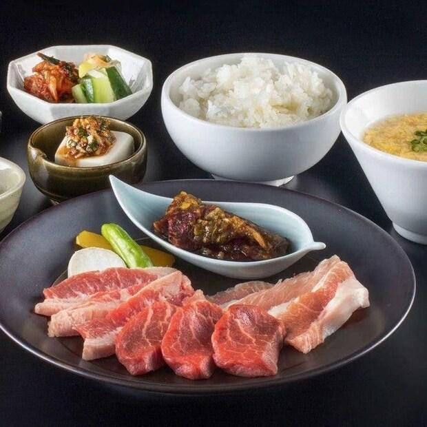 焼肉御膳Mサイズ+選べる1ドリンク(土日祝限定300円OFF):【焼物】中落ちカルビ・赤身ロース・トントロ・漬け込み和牛(お肉が3切れずつ)/【前菜】小鉢2種・キムチ・ナムル/【ご飯物】ライス・スープ/選べる1ドリンク1人1杯付き