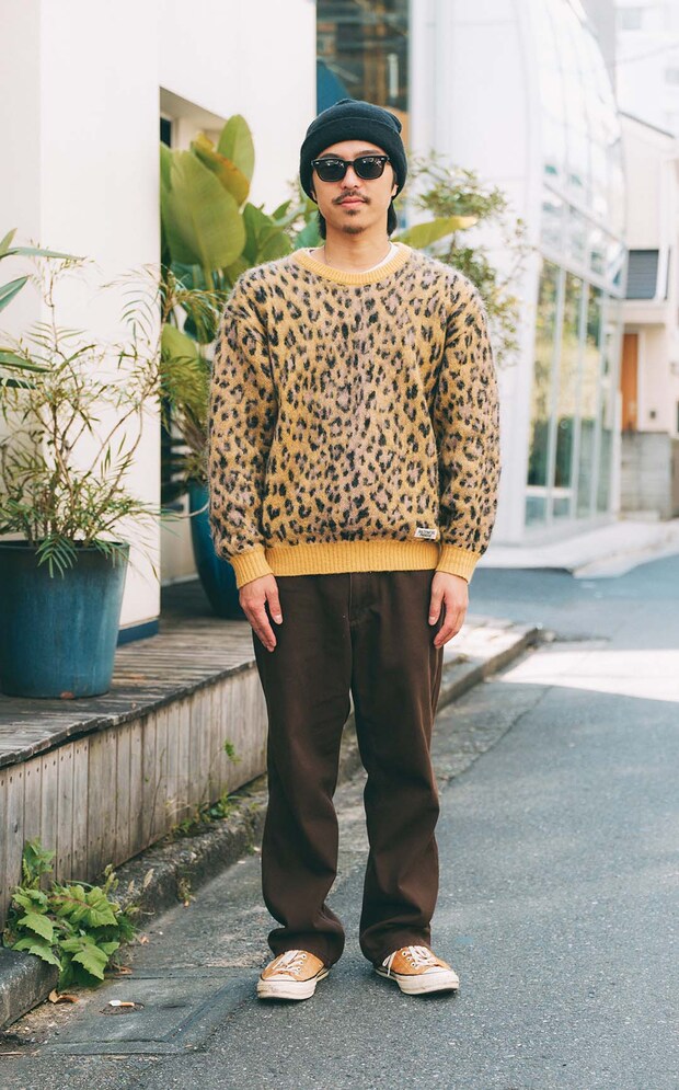 ワイルドでチャーミングな『ワコマリア』のレオパード柄ニットを主役にしたibukiさん。そこに、ブラウンのボトムと黒のニット帽を合わせて、落ち着いたアースカラーで大人っぽくまとめた休日コーデ。シンプルな色使いでニットの存在感を引き立てつつ、リラックス感のある着こなしがお見事!
