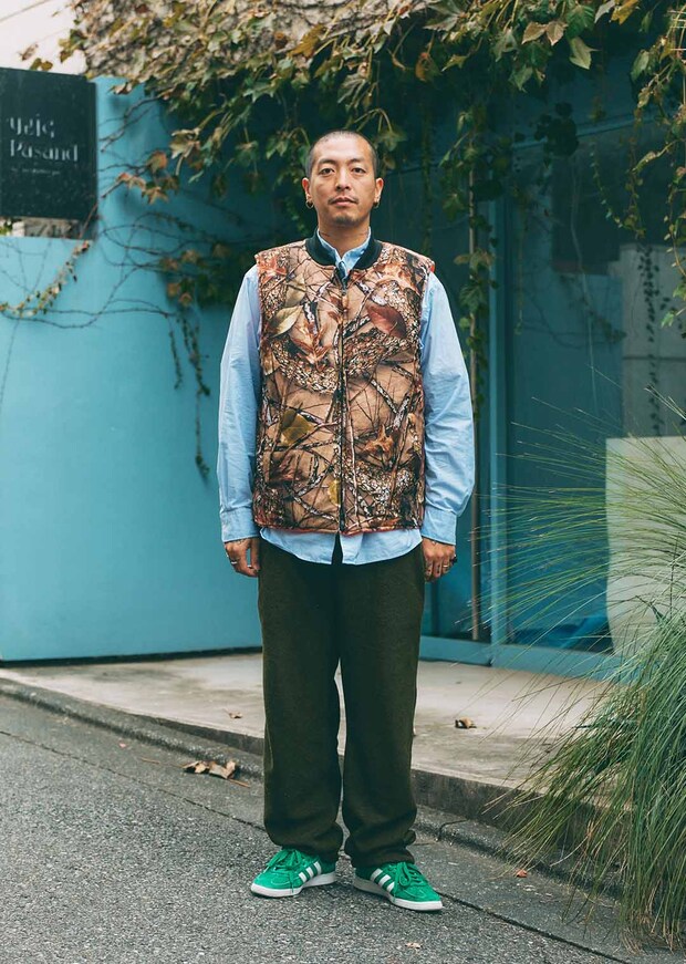 パッと視線を集めるリアルツリー柄の中綿ベストに、爽やかなブルーのシャツを合わせたほどよくエッジの効いたスタイルが素敵なJONさん。ボトムは今っぽいボア素材で抜け感をプラス。足元には『アディダス』のグリーンスニーカーを合わせて、コーデのアクセントに。
