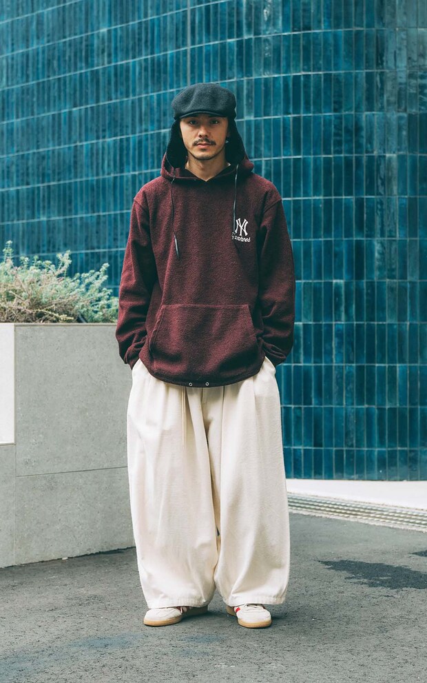 ふんわり広がるボリュームのあるシルエットが魅力の『シアーズ』のボトムに、ボア風のスウェットを合わせたベクトジョシュアアキラさん。重くなりがちな冬コーデも、ホワイトボトムで軽やかさと華やかさをプラス。イヤーフラップ付きハンチングで防寒対策もバッチリな冬のお出かけスタイル。