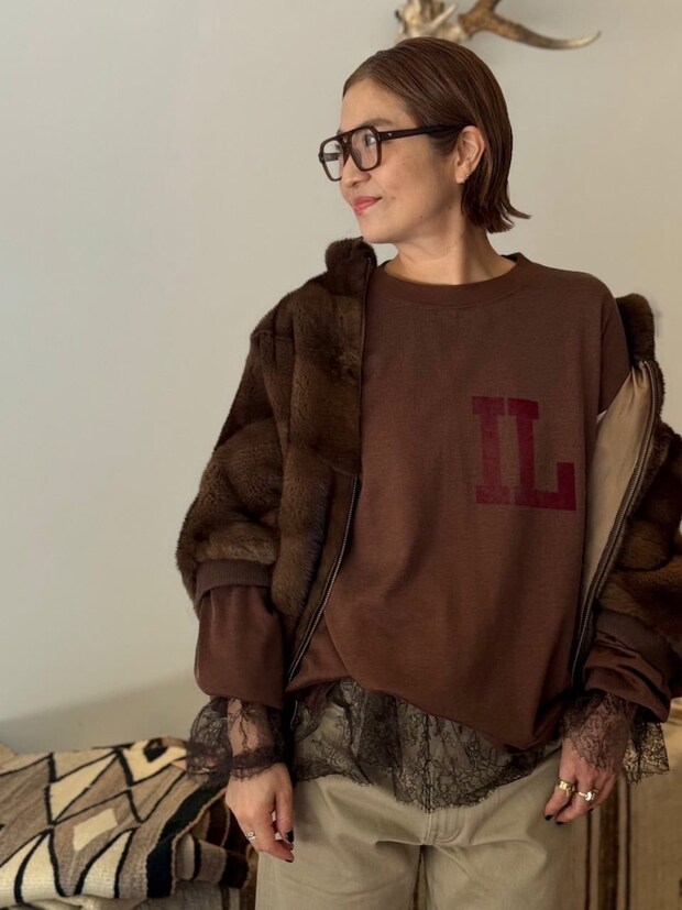 「今季イチオシの、ブラウンのワントーンコーディネートに仕上げました。オーセンティックなブラウンをチョイスしたミンクのブルゾンはクラシカルになりがちですが、フットボールTやチノパンツでカジュアルダウン。繊細なブラウンのレースブラウスをレイヤードしのぞかせることで、艶っぽさを取り入れました」