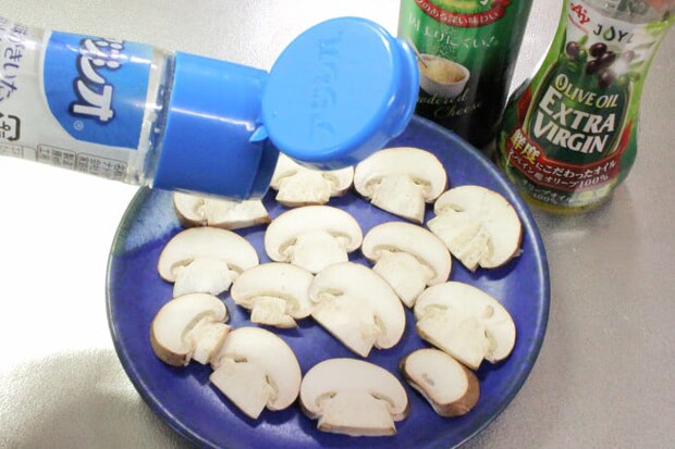そこでアジシオ®だけを振って食べてみると、マッシュルームの旨味がダイレクトに広がりますが、見た目はかなりそっけない印象に(笑)。映え感も兼ね備えるなら、アジシオ®、オリーブオイル、粉チーズがベストな組み合わせでした。