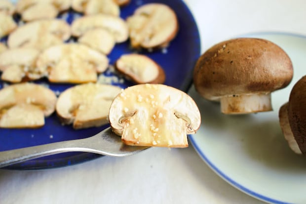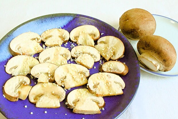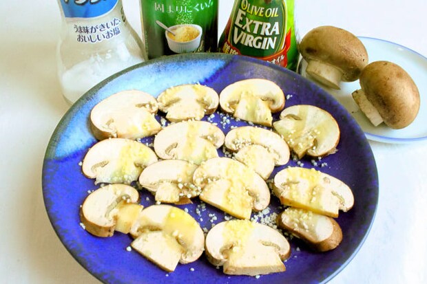 アジシオ®、オリーブオイル、粉チーズをかけた生のマッシュルームがこちら。新鮮なものを使ったので、断面を見ると、きめが細かい&密度も高いのが伝わってきます。