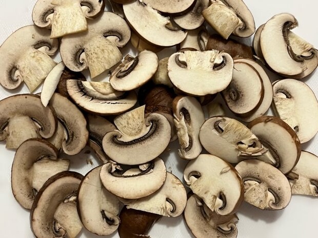 マッシュルームは出来るだけ薄く切るとのこと。1.5mm幅くらいの薄切りにすると、マッシュルーム2個でお皿いっぱいになりました。そこで今回は、2個分で作ることに。