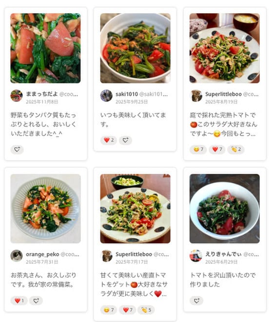 つくれぽ(みんなのつくりましたフォトレポートのこと)でも、「野菜がおしゃれにおいしく食べられて良かったです」「マヨネーズあえよりヘルシーで軽いので重宝しています」といった声がたくさん届いています。