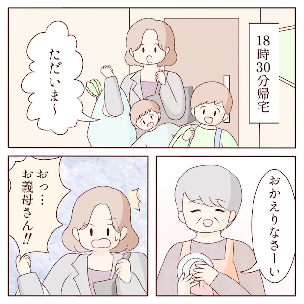 仕事を終えて4歳のタクミ、2歳のソウタを保育園に迎えに行った帰りにスーパーで買い物を済ませて帰宅するのが私のルーティン。夕方はバタバタです。帰宅すると、義母が「おかえりなさーい」と立っていました。「お、義母さん!?」