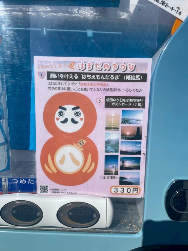 紙絵馬は、絵馬掛所の横や、市内にある「浜田の夕日」ラッピング自販機でも購入できます!(浜田市の夕日ポストカード+紙絵馬 330円)