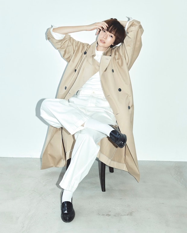 ローファー¥9,130(ハルタ)、トレンチコート¥148,500(エイトン/エイトン青山)、中に着たシャツ¥54,780(サヤカ デイヴィス/ショールーム セッション)、Tシャツ¥1,870(ヘインズ/ヘインズジャパン カスタマーセンター)、パンツ¥47,300(ギャルリー・ヴィー/ギャルリー・ヴィー 丸の内店)、ソックス¥2,750(ブルーフォレ/リトルリーグ インク)