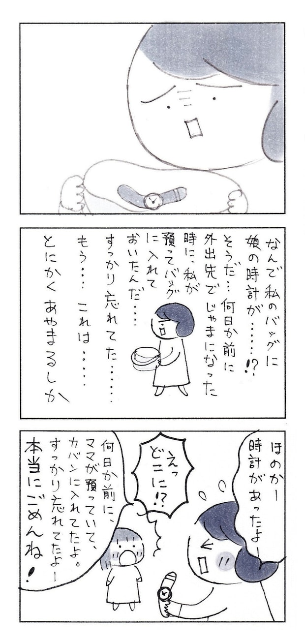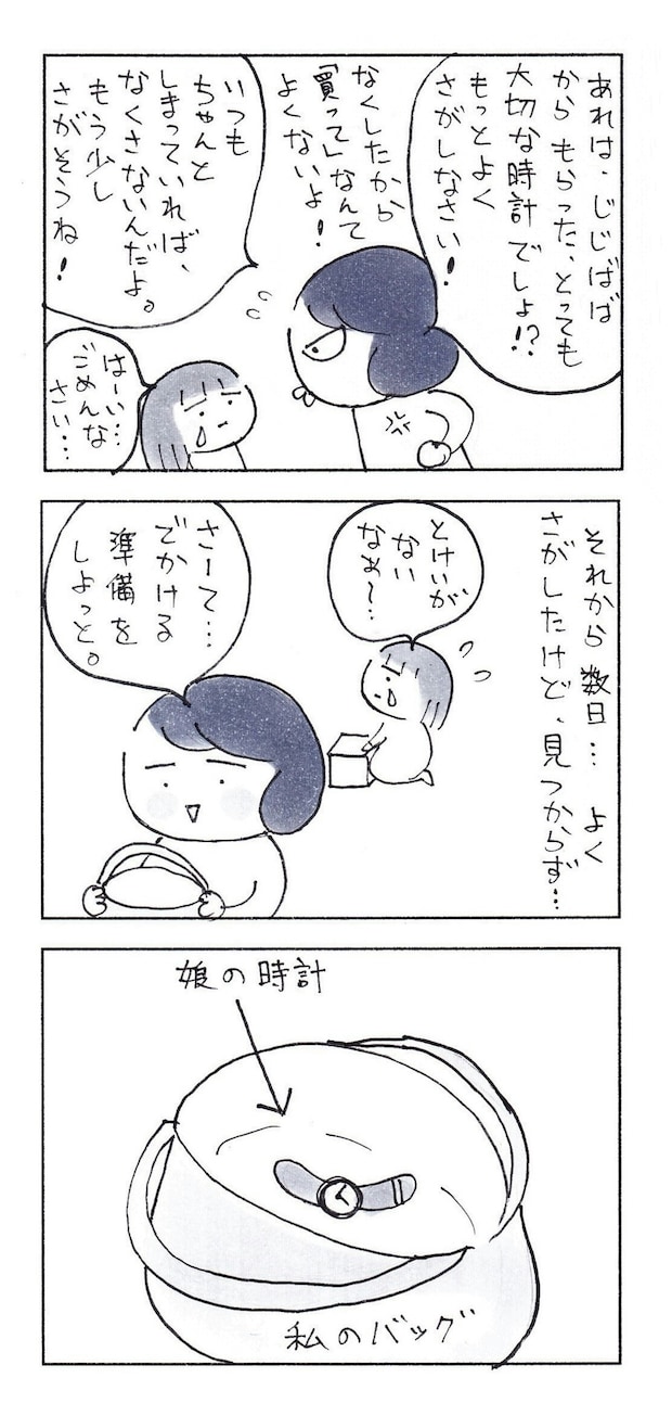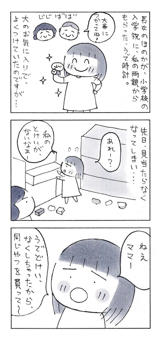 投稿者・なりたりえ(@rienarita)さんの当時7歳の娘さんは、祖父母にもらったお気に入りの腕時計を失くしてしまったそう。「よく探しなさい」と注意したりえさんですが、外出先で預かっていたことに気がつき…?その後の対応と娘さんの言葉に、胸が温かくなるエピソードです。
