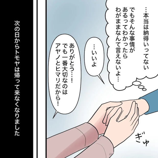 「・・本当は納得いってない。でもそんな事情があるってわかったら、わがままなんて言えないよ・・いいよ」私がそう言うと、「ありがとう・・!でも一番大切なのはアヤノとヒマリだから!」そう言ってトモヤは私の手をぎゅっと握りました。強い絆で結ばれているトモヤと私、そう思っていたのに・・。