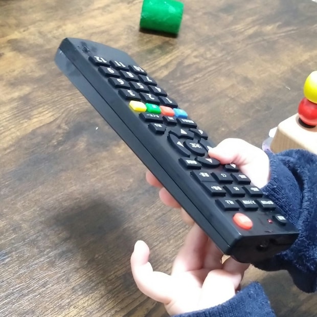 DAISOで売られている550円の互換リモコンを、リモコン大好きな娘さんに与えたのです。おもちゃではなく、実際にテレビ操作が可能なちゃんとした本物のリモコンです。小さな手でしっかり握りしめている姿がとってもキュート。