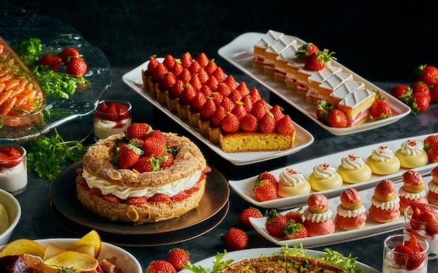 甘味と酸味のバランスに優れ、みずみずしさが特徴のブランドいちご「女峰」を贅沢に使用するショートケーキをはじめ、時期ごとにいちばんよい状態のいちごをふんだんに盛り付けるタルト、ホワイトチョコレートのやさしい甘みといちごの爽やかな酸味が調和するムースなど、心躍る品々をビュッフェスタイルで好きなだけ楽しんで。