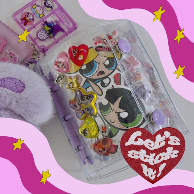 〈エスターバニー〉の小物入れはふわふわで可愛い!〈パワーパフガールズ〉のキーホルダーはガチャガチャで当たりました。ミニミニアルバムはシーインで購入。余ったシールやもらったシールなどを貼っています。