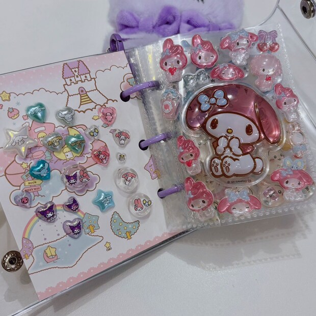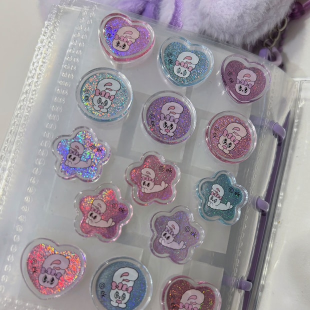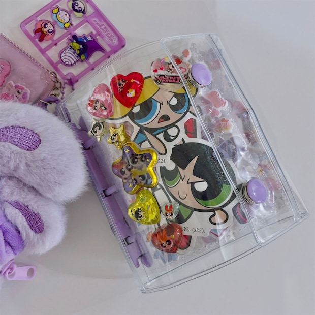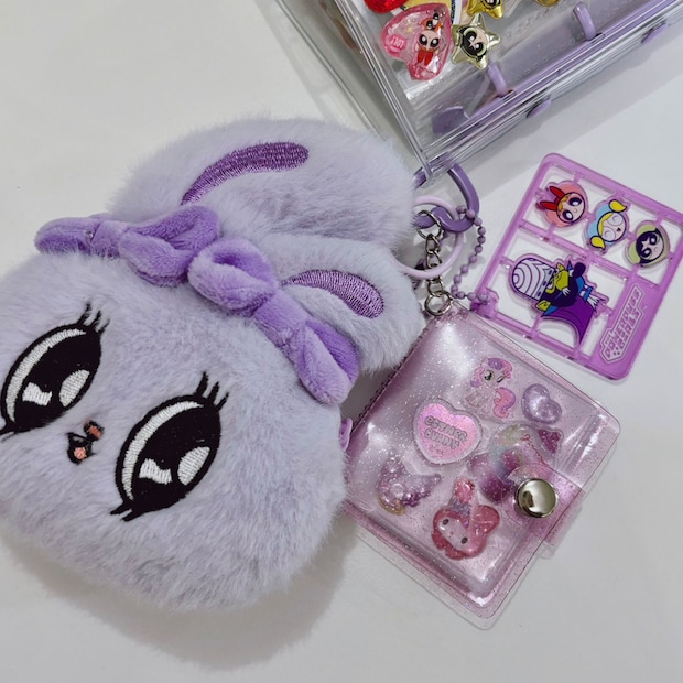 〈エスターバニー〉の小物入れはふわふわで可愛い!〈パワーパフガールズ〉のキーホルダーはガチャガチャで当たりました。ミニミニアルバムはシーインで購入。余ったシールやもらったシールなどを貼っています。