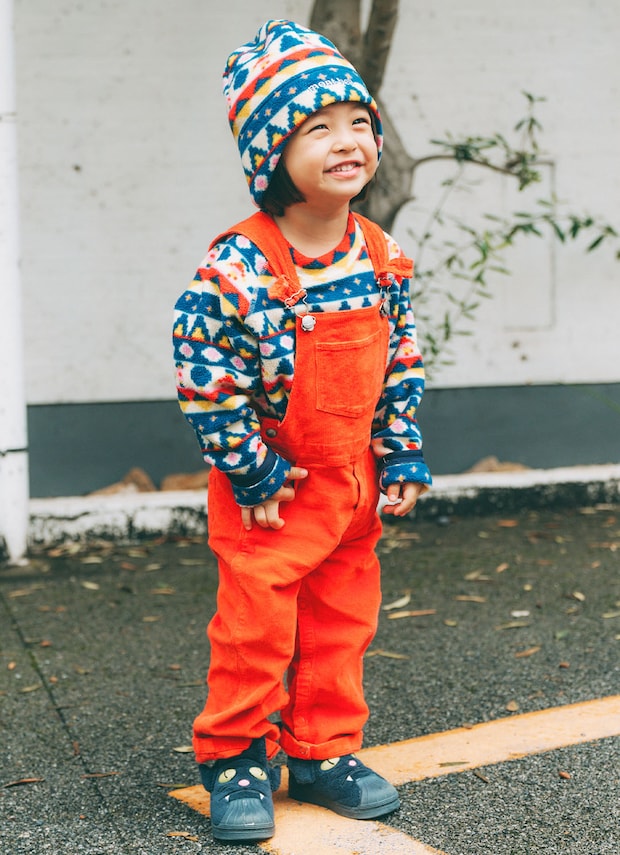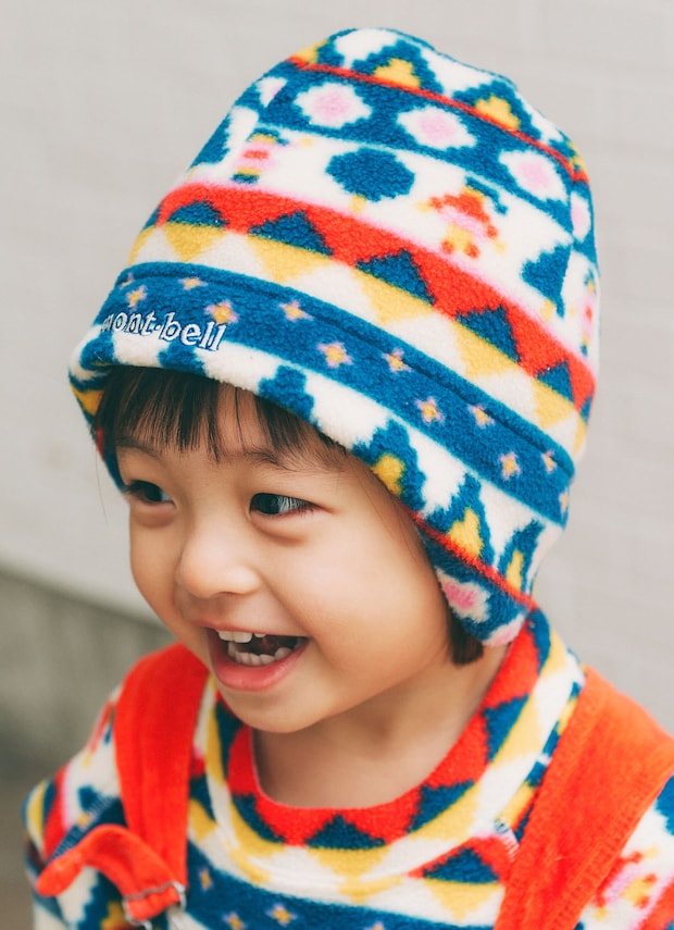 『モンベル』のカラフルなノルディック柄がハッピーな冬を演出。フリースとハットをお揃いにすることで統一感のあるキッズスタイルの完成!