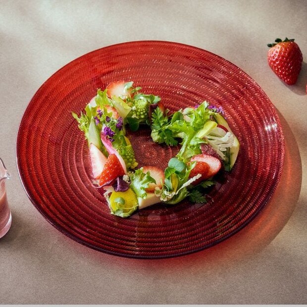 ストロベリーのカプレーゼサラダはハート型に盛り付けて提供される。あたたかい気持ちとともに季節ならではの味わいを堪能して。