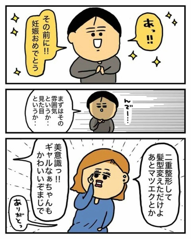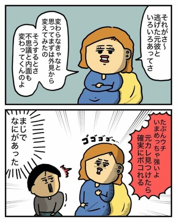 久しぶりに会った幼稚園からの幼馴染なぁちゃんは、すっかり見た目がギャルになっていました。その理由を聞くと、「逃げた元カレといろいろあって、変わらなきゃと思って外見から変えた」そう。そうすると不思議と内面も変わって強くなったと話すなぁちゃんに驚くエクボさん。