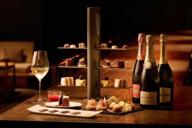 ルイ・ロデレールを含む3種類のシャンパン、ワイン、生ビール、ウイスキー、そして紅茶などのフリーフローとともに、スイーツやセイボリーが楽しめるのがうれしい。フードには、栗とラム酒のボンボンショコラや生ハムのセイボリーを追加し、よりお酒に合うテイストに。さらに「フォンダンショコラ ラズベリーソース添え」は、ハイティー用に洋酒を使用したものを締めの1品として提供される。