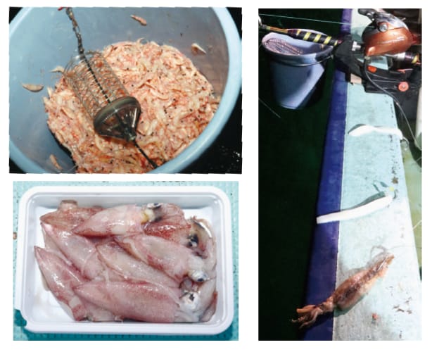▲コマセはオキアミ/小型のイカは持参となる/3本バリにイカの切り身もしくは小型のイカだけでもいいし、写真のように両方付けてもOK