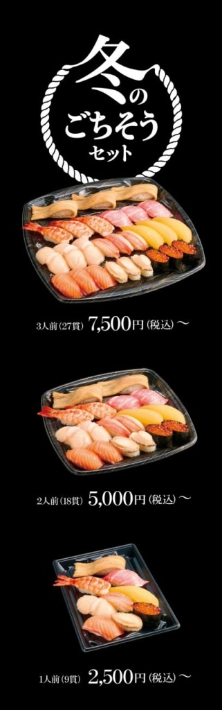 なお、スシローでは、期間限定の豪華ネタなどを詰め合わせた「冬のごちそうセット」の予約を受け付けている。