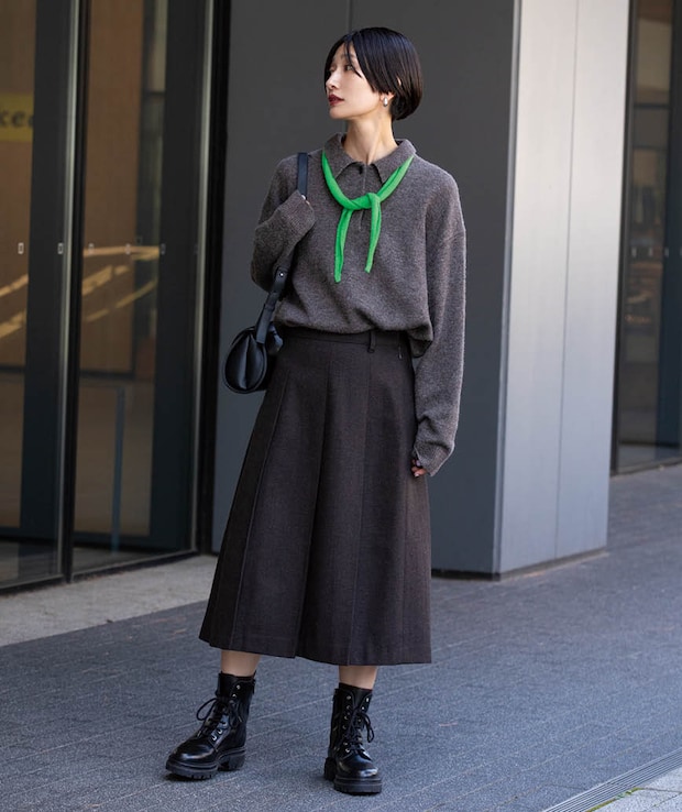 「メンズライクなポロニットに、今季らしいミディ丈のプリーツスカートを合わせ、ブーツでバランスを取りました。グリーンのスカーフでキャッチーに♡」