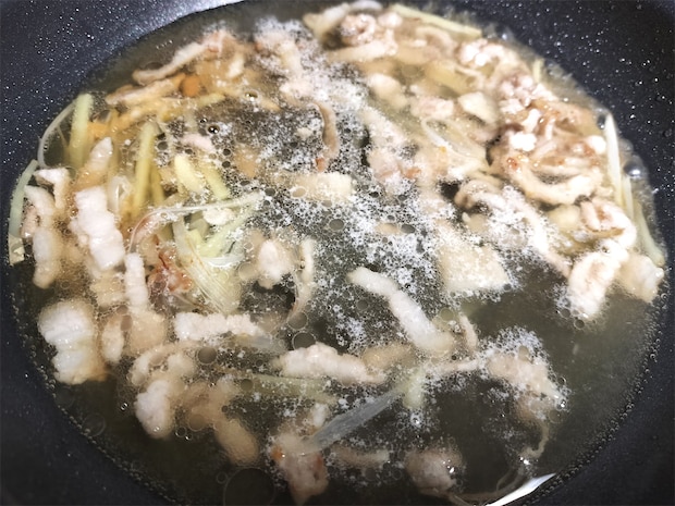 1. フライパンに太白胡麻油をひき、強火で豚肉を炒めます。