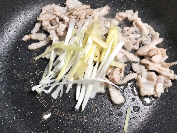 2. 色が変わってきたら、長ねぎとしょうがを加えて炒めます。