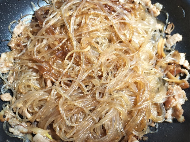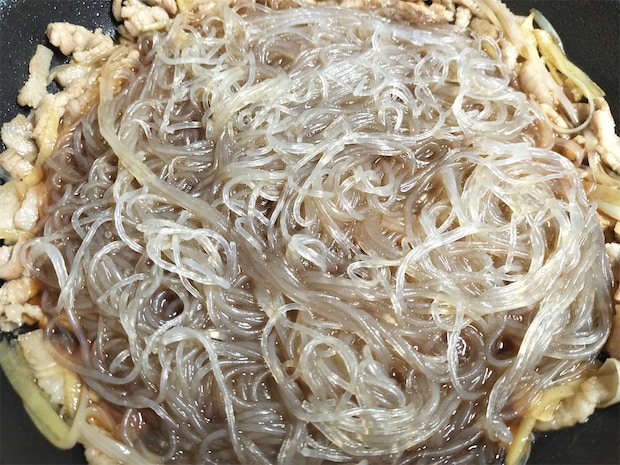 5. 春雨を入れてほぐし、フタをして弱めの中火で15~20分煮ます。