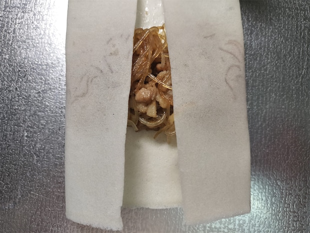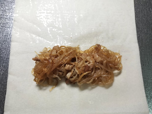 細切りにした豚肉もいい味ですが、この春巻きの主役は何と言っても春雨です。自分で作っているのでフカヒレだ!とはだまされませんが、確かに食感はよく似ていて、知らずに出されたらだまされてしまうかもしれません。しっかりとスープを吸わせていますので春雨自体にも旨味があり、とてもおいしい春巻きが出来上がりました。