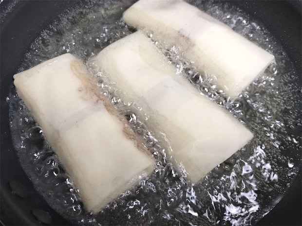 9. 160~170℃の油(分量外)に入れ、ときどき裏返しながらきつね色になるまで揚げます。