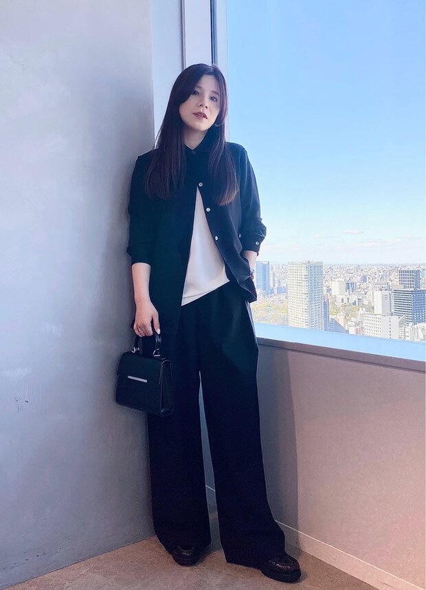 ブラックコーデに春らしいイエロ―シャツをプラスしたレイヤードスタイル。「一見シンプルに見えるシャツですが、端が全てメロー始末されていたり、表面にニュアンスがあるジョーゼット素材を使用しているので、着るだけでどこか柔らかく女性らしい印象に」