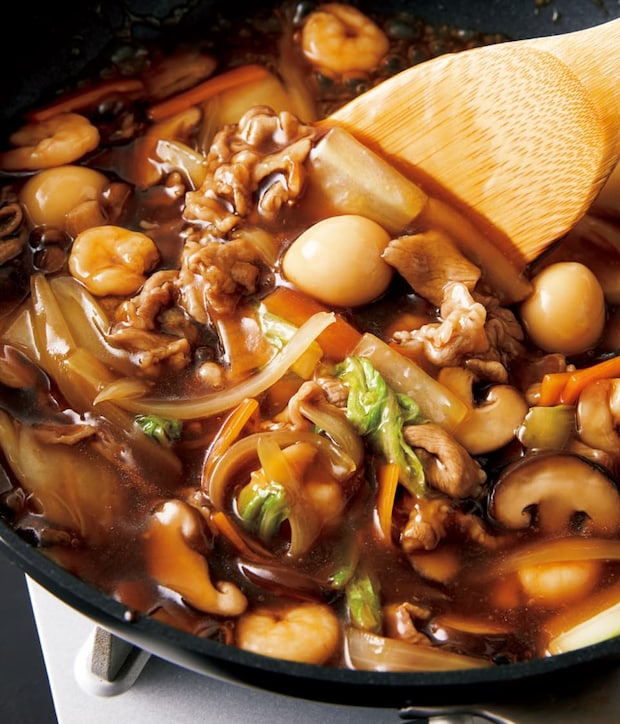 とろみ具合は、最初のサラサラの状態から少し重みを感じる状態になればOK。水溶き片栗粉は沈殿しやすいので、加える直前に混ぜること。