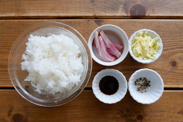 耐熱皿に刻んだベーコンをのせ、ラップをかけてレンジ600Wで20〜30秒加熱します。ごはん、ベーコン、とろけるチーズ、しょうゆを合わせて混ぜます。