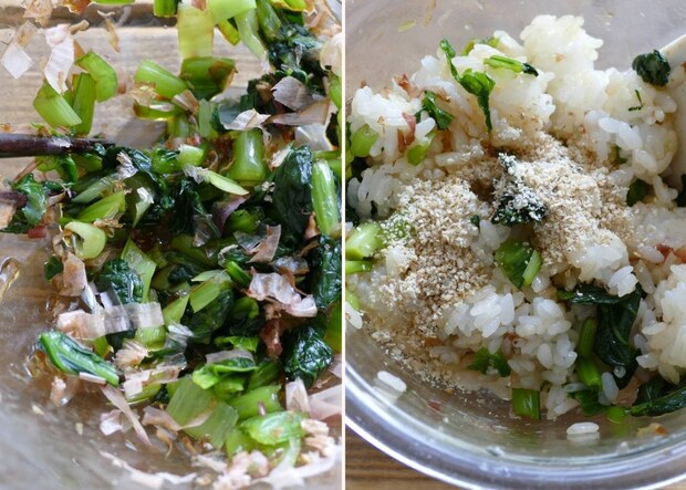 下ゆでして刻んだ小松菜にしょうゆとかつおぶしを混ぜます。ごはん、おひたし、白すりごまをさっと混ぜます。