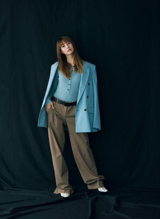 ジャケット¥284,000、ニット¥149,600、パンツ¥169,400、ベルト¥69,300、シューズ※参考商品(全てステラ マッカートニー/ステラ マッカートニー ジャパン)