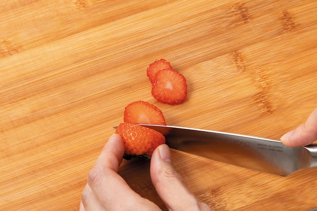 1. いちごはヘタを取り、バナナとともに薄くスライスする。
