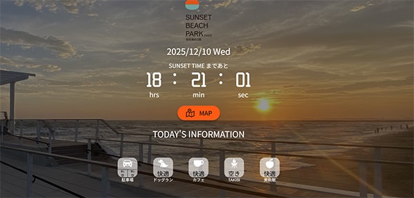 ワールドパークは、千葉県千葉市にある稲毛海浜公園の来園者の利便性向上と、海辺の魅力発信を目的として、園内の混雑状況をリアルタイムで確認できる「SUNSET BEACH MAP」と、海辺の夕日を楽しむためのSUNSET TIMEカウントダウンを搭載した新ウェブサイトを、12月16日(火)12:00~公開する。