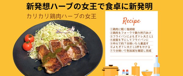 カリカリチキンなど、さまざまな料理を楽しむことができる。別名「万能だれッシング」と呼ばれるヨモギドレッシングで、食卓を料理研究所にしてみよう。