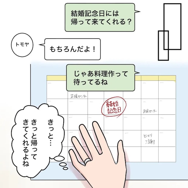 「結婚記念日には帰って来てくれる?」さすがに結婚記念日は帰って来るだろうとメッセージを送ると「もちろんだよ!」と返信が。「じゃあ料理作って待ってるね」と返信し、「きっと・・きっと帰ってきてくれるよね」と心の中で祈るような気持ちでした。